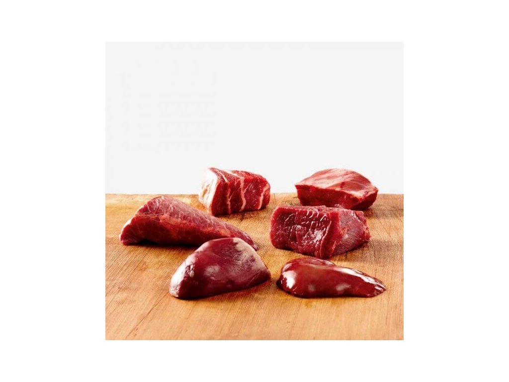 - složení: 38 % hovězí (játra, plíce, maso, ledviny, srdce, vemeno), 18 % kuřecí (srdce, žaludek, krk), 5 % krůta (srdce), 6 % zvěřina (maso), chlorid sodný, uhličitan vápenatý